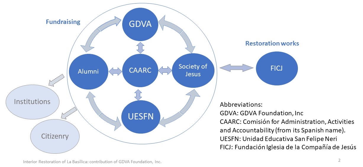 All participations are free, voluntary, and without any remuneration, without seeking private benefit or self-promotion. No person shall be entitled to any payments or compensations, either in full or as a percentage of any amount of allocated funds, either from direct contributions, or from contributions obtained through them from third parties (such as their contacts with other donors). No economic contribution, either directly done by any person or obtained through them -after contact- from third parties shall be allocated in private accounts, but directly and exclusively to the bank account open by the Society of Jesus, Ecuador, for the specific purpose of fundraising for the internal restoration of La Basílica, and managed by the “Commission for Administration, Activities, and Accountability”. Every contact, third party, or prospective donor, should be redirected to the website of the project -the current website, where all necessary details for transfers and donations are currently available in the English and Spanish languages. Every independent fundraising initiative is welcome in principle, but we all need to act in coordination, in an organized way, and always inform and raise awareness about the project among prospective donors, people and institutions. No person is allowed, have the permission, or should feel entitled to act on behalf of, or otherwise take the names of the Society of Jesus, Unidad Educativa San Felipe Neri, GDVA Foundation, Inc., or any of their members, or those of any other people or institutions close to the project without their explicit consents, and by no means to achieve personal or private purposes of any kind.